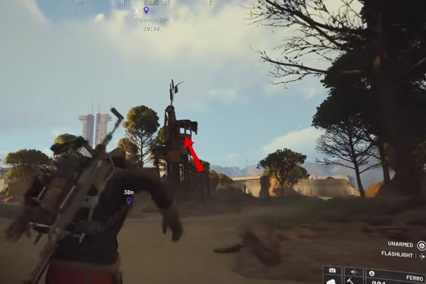 Una volta completato, vai a nord dell’Hangar di manutenzione fino alla vecchia Torre dei Raider. Sali in cima alla torre e usa il terminale lì. Questo aggiornerà la missione per te.
