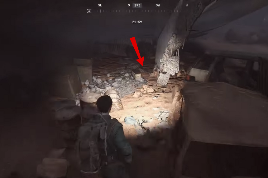 Una volta raggiunto il ponte, cerca l’ultima sezione della strada dissestata separata dal resto, appena oltre un paio di rottami. Vai sotto il lato destro di quella strada interrotta e troverai una piccola scatola con cui puoi interagire.
