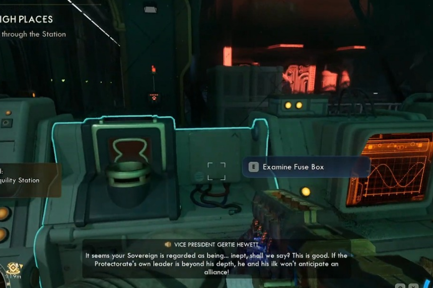 Puoi aggirare o combattere la prima guardia che incontri, a seconda del percorso fornito dal dialogo. In ogni caso, dopo aver affrontato la guardia, sentiti libero di prendere il terminale vicino per i protocolli dei protocolli di targeting della Stazione della Maggiore Tranquillità: potresti considerarli come uno strumento utile in seguito e prendere un fusibile dalla stazione per alimentare il prossimo ascensore.