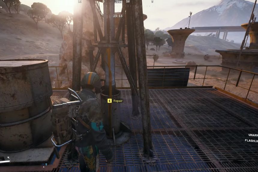 Una volta che sei pronto, prenditi un momento per scansionare l’area. Altri giocatori o droni potrebbero trovarsi nelle vicinanze ed è meglio non farsi prendere alla sprovvista. Quando le cose sembrano chiare, trova la scala attaccata al deposito e sali sul tetto. Interagisci con l’antenna per iniziare il processo di riparazione, ma sii pronto, ripararla fa molto rumore e potrebbe attirare i nemici.