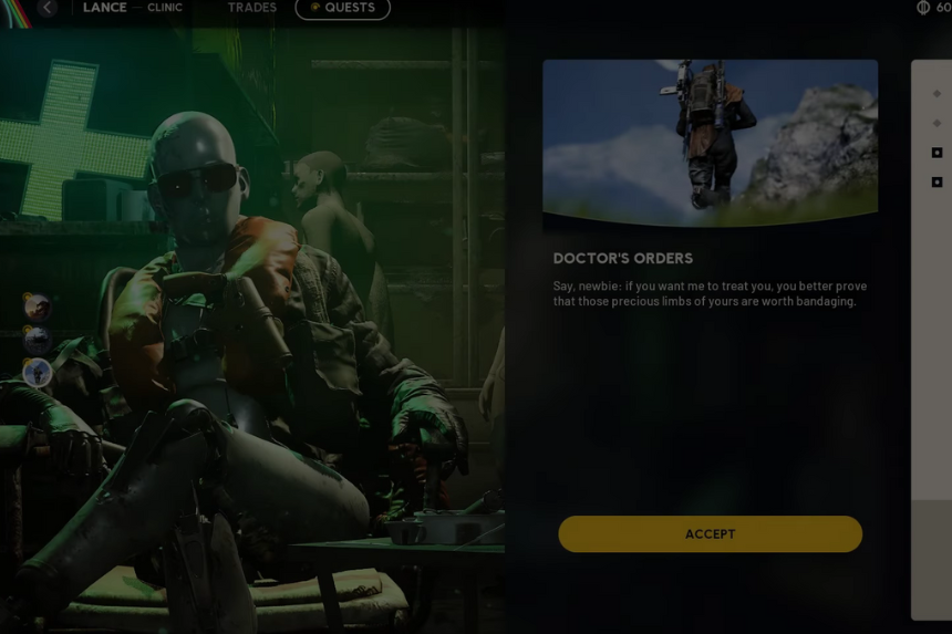 Riceverai la missione Doctor’s Orders dal commerciante Lance. Di solito puoi trovare Lance nell’area dell’hub principale o in uno dei posti di scambio dove viene assegnata la maggior parte delle missioni. Avvicinati e parla con lui e ti darà la missione Gli ordini del dottore per iniziare.