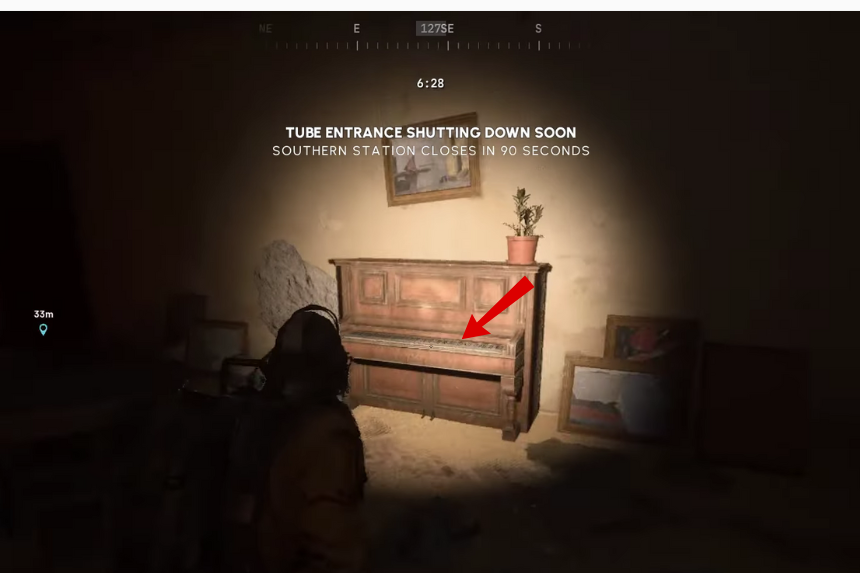 Subito dopo aver sceso le scale, guarda dritto davanti a te. Davanti a te sarà presente un dipinto murale che funge da primo indizio. Quindi vedrai un pianoforte situato dietro di te. Il secondo oggetto della missione viene posizionato sopra di esso.
