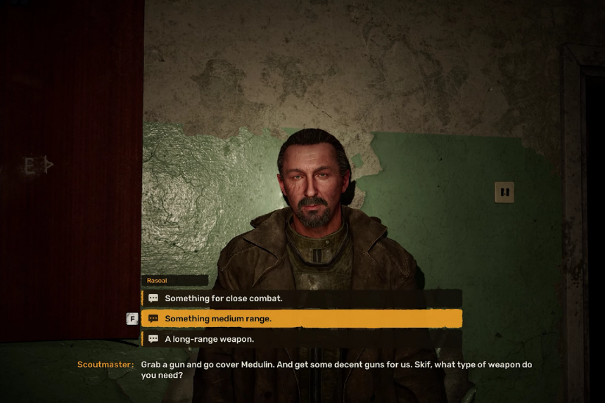 Il capo scout ti chiederà quindi che tipo di arma desideri. Hai tre opzioni tra cui scegliere. Puoi scegliere tra l’arma da combattimento ravvicinato, l’arma a medio raggio o l’arma a lungo raggio. Dopo aver scelto la tua arma preferita, Rascal ti chiederà quale arma desideri: quella locale o quella straniera. Scegli quello che si adatta al tuo stile di gioco. Il capo scout ti darà quindi un occhiale per la visione notturna, se disponibile. Se i mercenari vengono di notte per ucciderti, puoi usare questo.