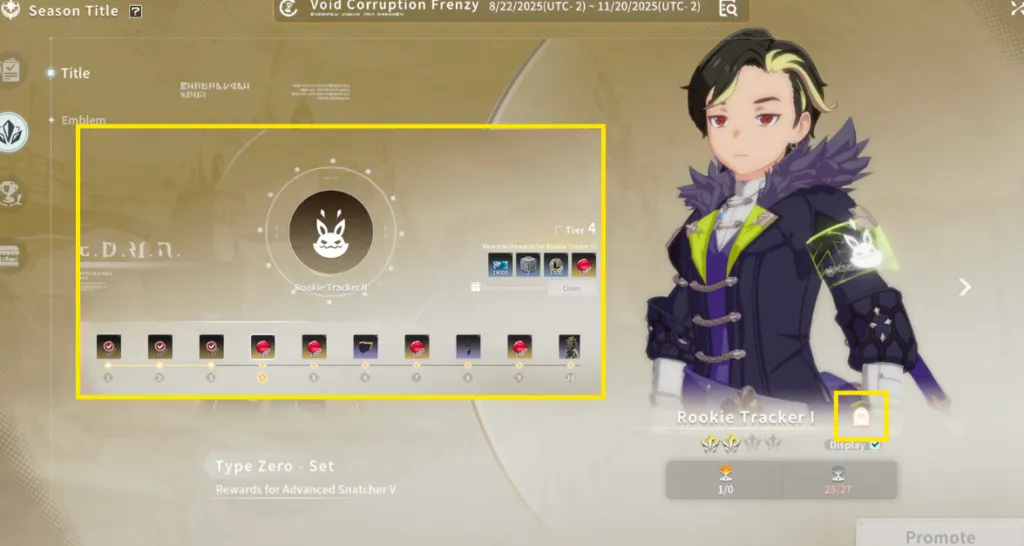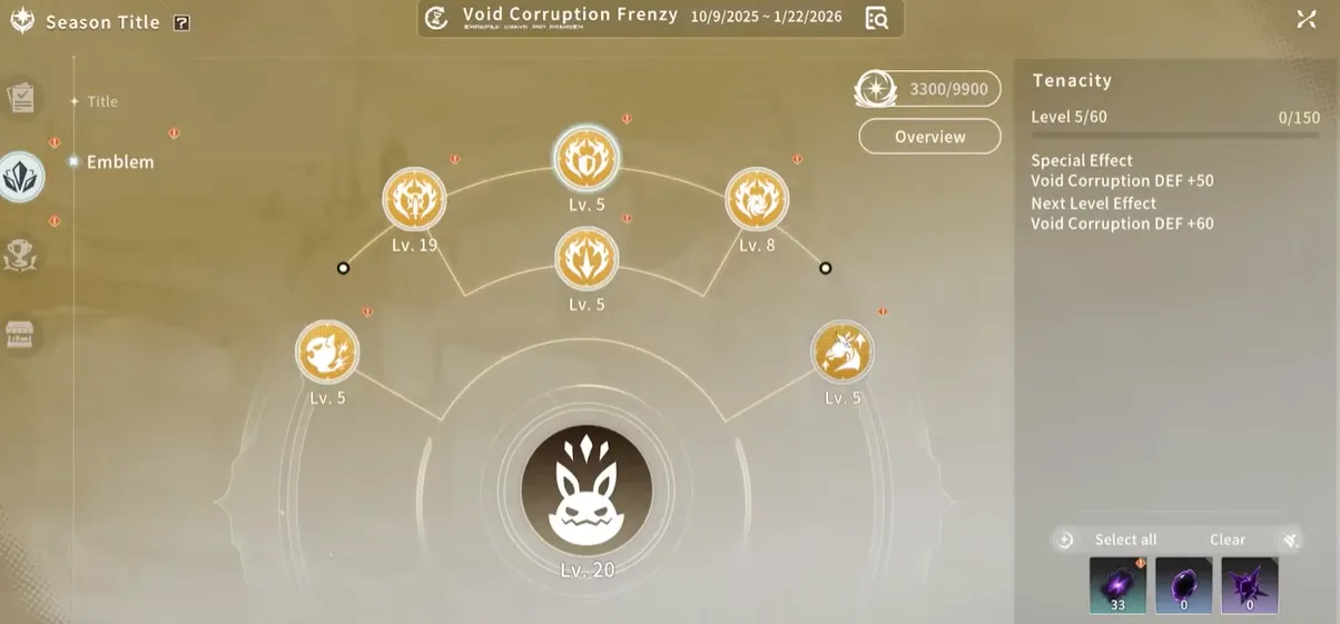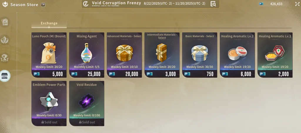 - I materiali stagionali dell’emblema, come Residuo del Vuoto e Aura del Vuoto, diventeranno gradualmente disponibili per l’acquisto man mano che la stagione avanza in tempo reale, con un limite settimanale di x100 ciascuno.