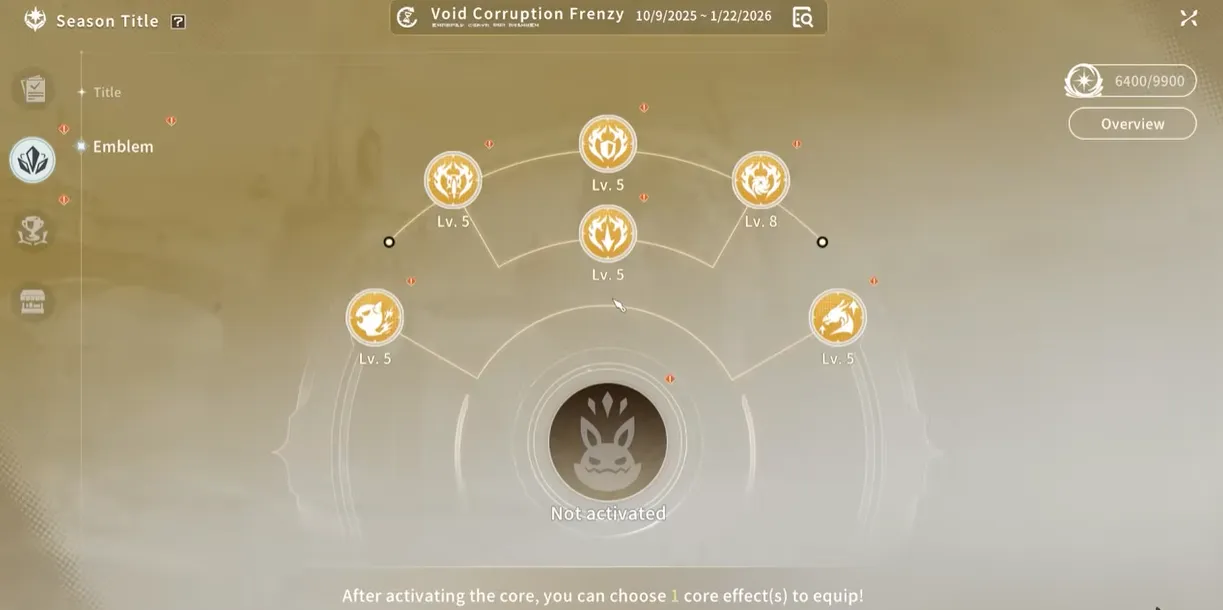 - Una volta raggiunti i 30 livelli totali dei nodi, i giocatori sbloccano l’Emblem Core, che utilizza Emblem Power Parts, Bound Luno e Season Points per salire di livello.