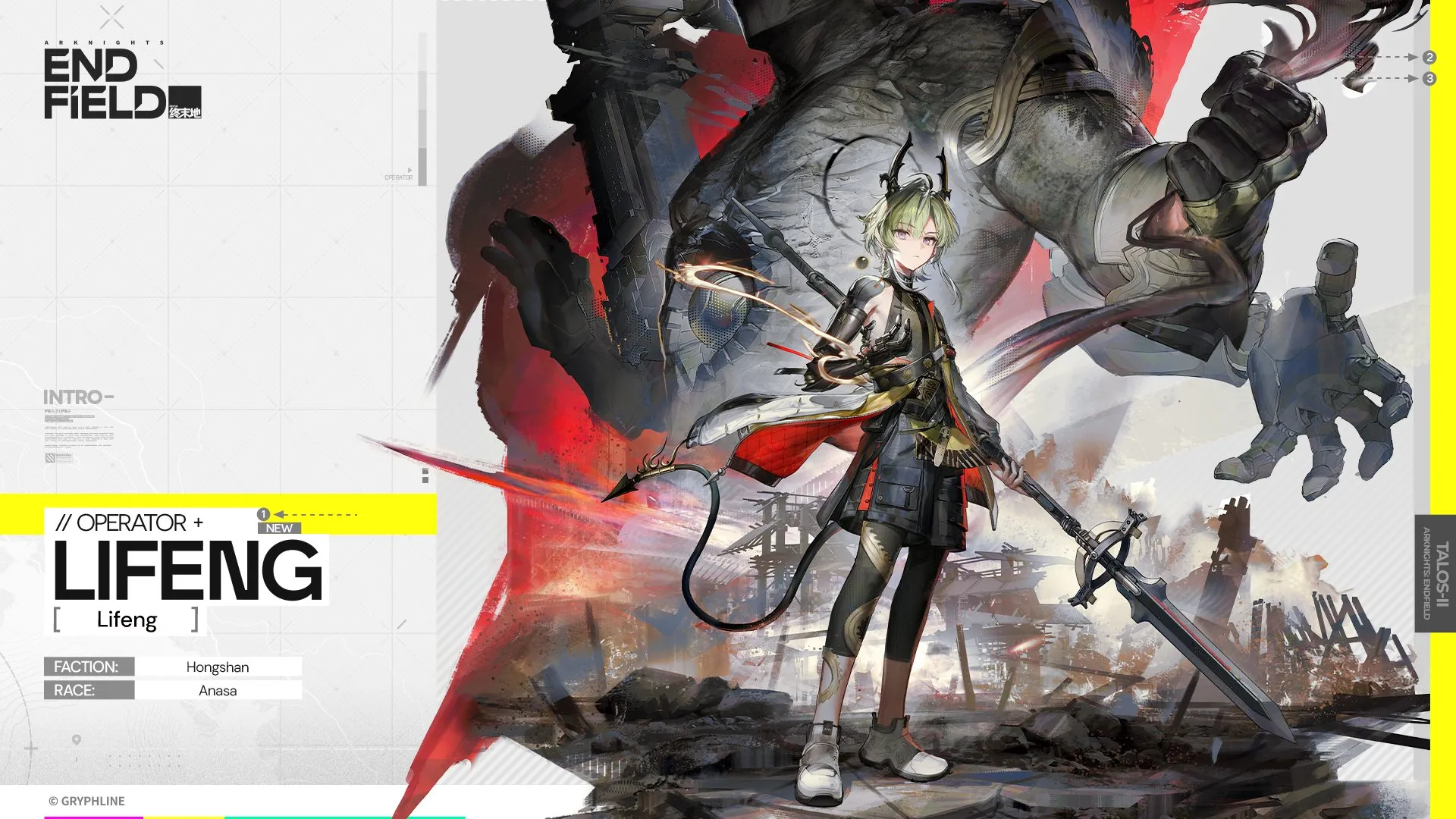 Lifeng è un membro delle guardie della città di Wuling che attualmente sta stagista presso la divisione tecnica specializzata di Endfield Industries.