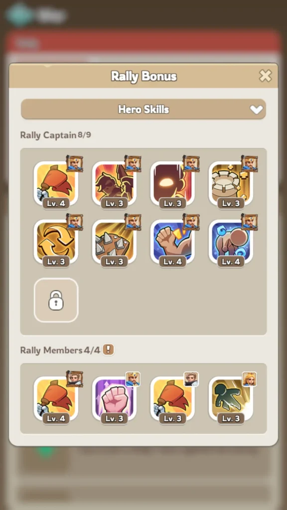 Come accennato in precedenza, il Capitano del Rally contribuisce con 9 abilità di spedizione provenienti dai 3 eroi selezionati. In aggiunta a ciò, i membri del rally aggiungono altre 4 abilità al rally. Questi provengono dall’abilità massima di livello più alto del primo eroe nella formazione di ciascun membro del Rally.