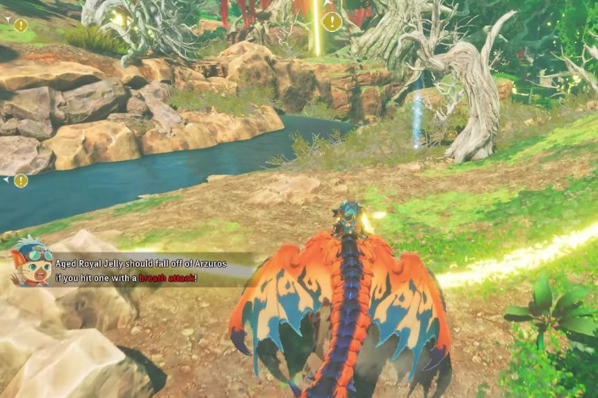 Successivamente, vai nella foresta di Howlin Yowl e cerca Arzuros. Porta un Monstie con l’abilità soffio, quindi usa quell’abilità sul mostro per liberare la pappa reale invecchiata. Una volta ricevuto l’oggetto, devi partire immediatamente.