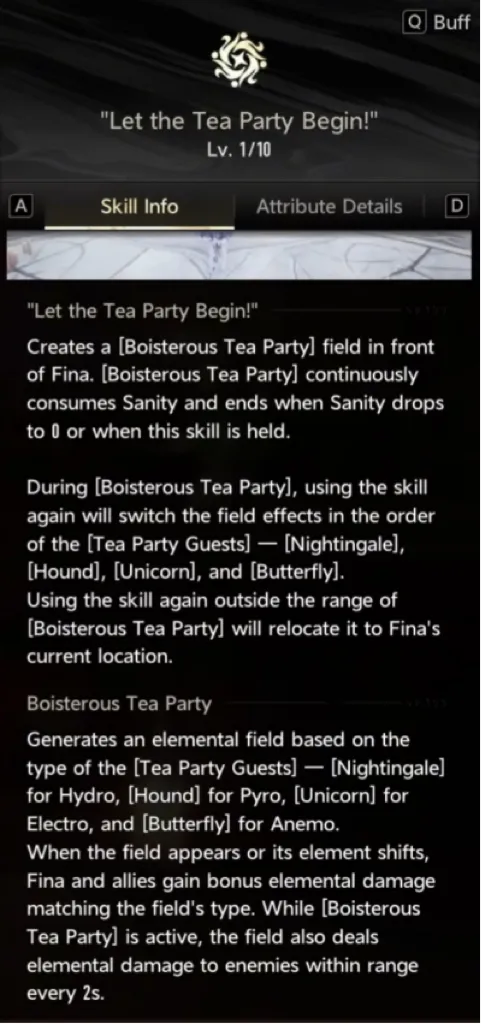 · Buff chiave: quando appare il campo o il suo elemento cambia, Fina e i suoi alleati ottengono un bonus al DAN elementale corrispondente al tipo del campo.