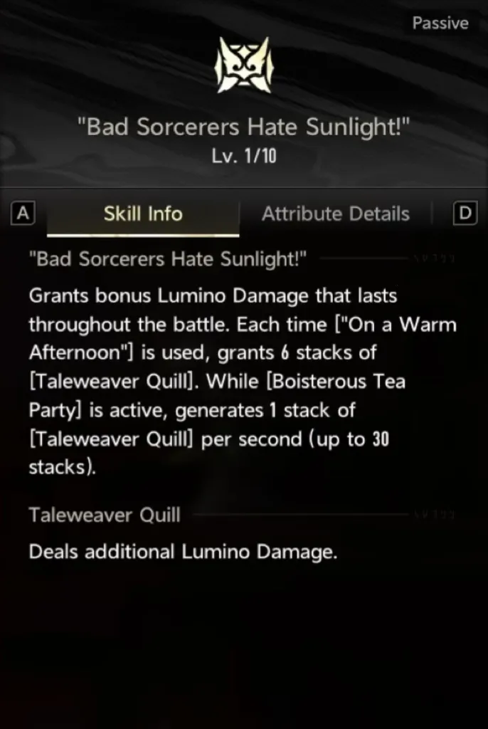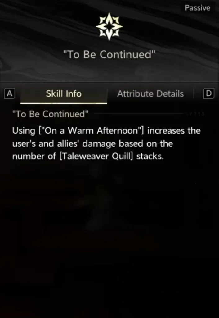 ·DAN abilità (importante): aumenta direttamente il danno delle sue pile di Piuma del Tessitore di Storie e del campo Boisterous Tea Party, migliorando il suo contributo al danno personale e il bonus al danno fornito dalla sua passiva.
