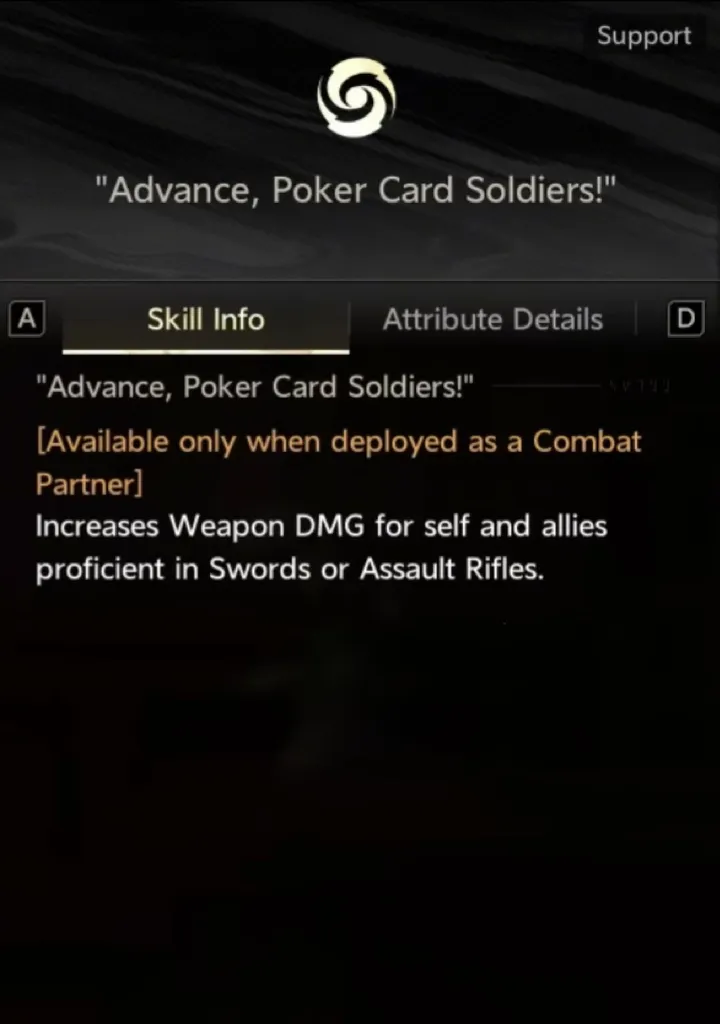 ·Avanza, Soldati di carte da poker!: (Disponibile solo se schierato come partner di combattimento). Aumenta il DAN delle armi per sé e per gli alleati esperti in spade o fucili d’assalto.