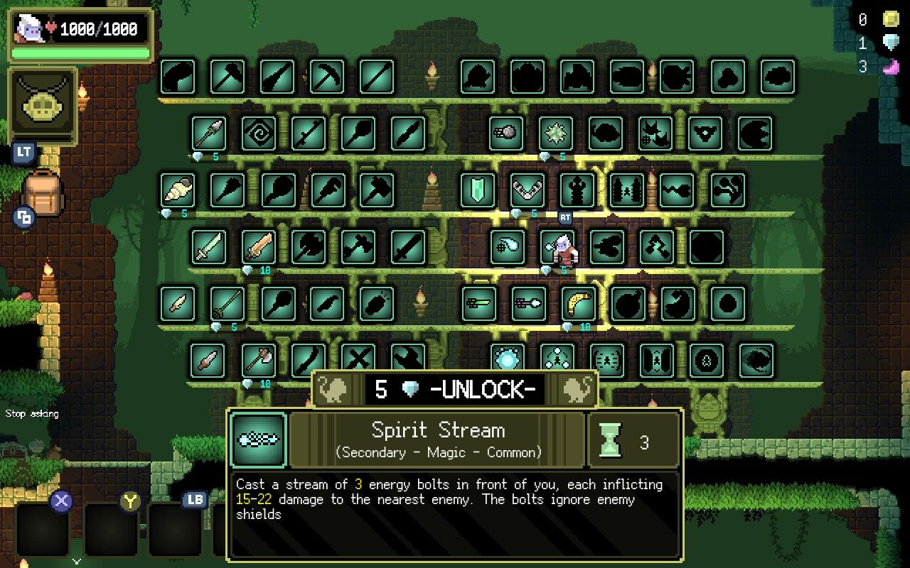 Con oltre 70 armi da sbloccare, l’arsenale di Dunjungle all’inizio sembra travolgente. Troverai coltelli, lance, spadoni da mischia e un’assurda varietà di opzioni magiche e a distanza. Ogni arma può ricevere potenziamenti che aggiungono danni da fuoco, ghiaccio o fulmini o addirittura attivarsi due volte per utilizzo.