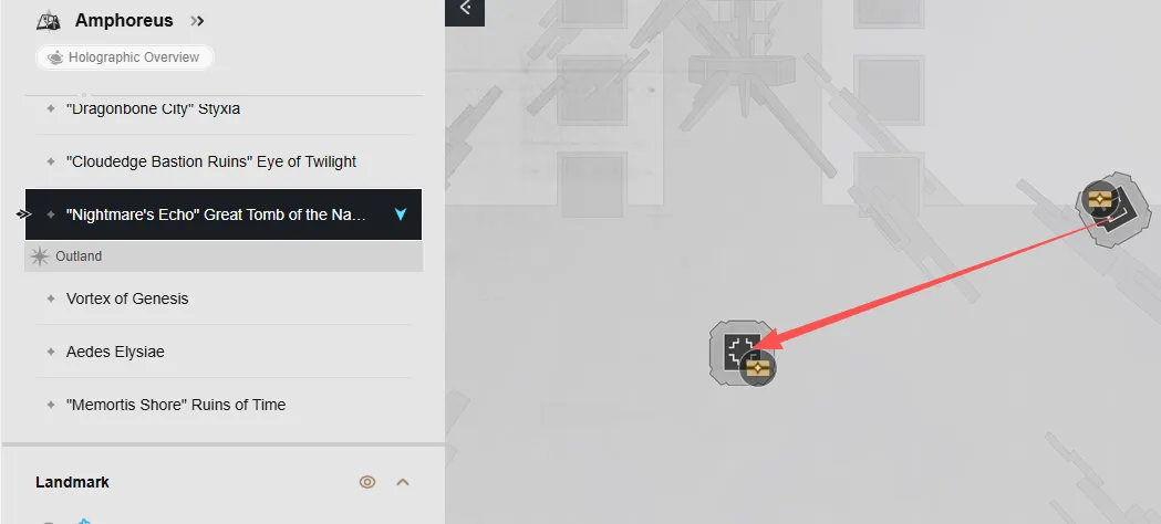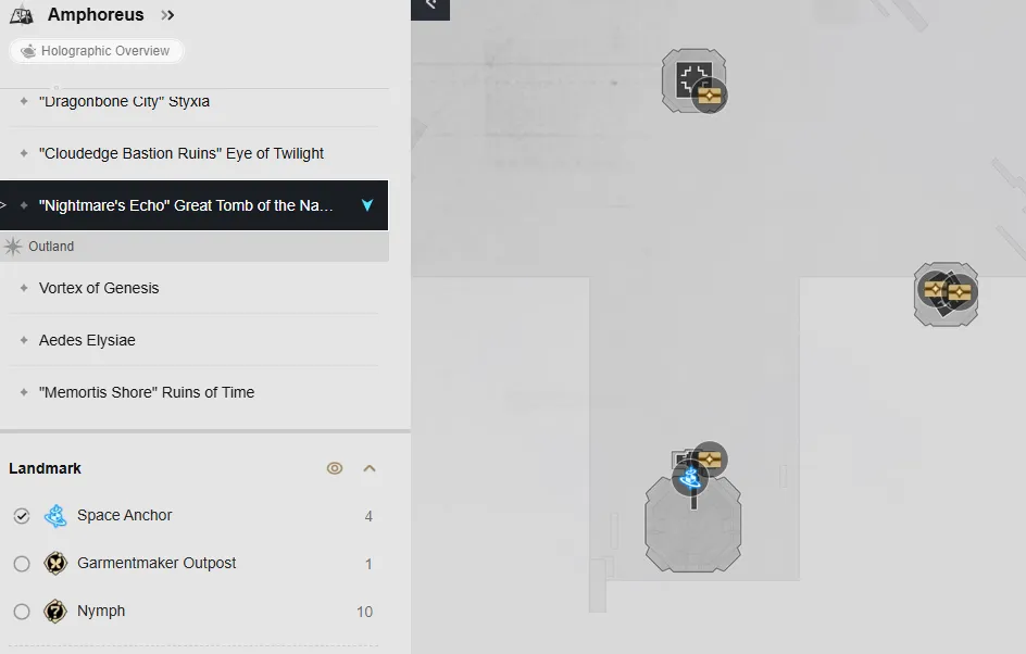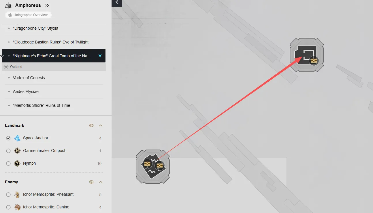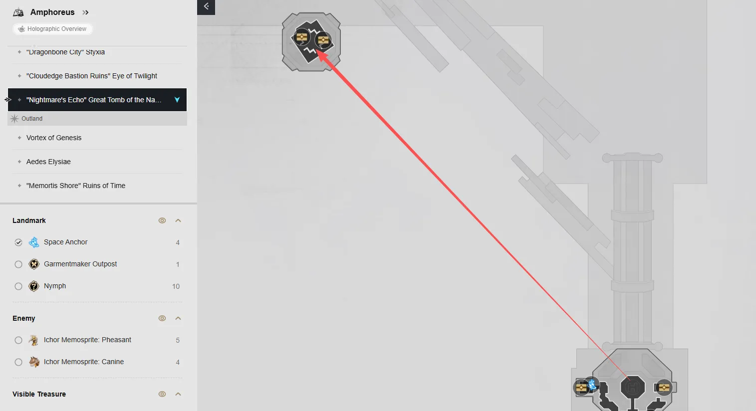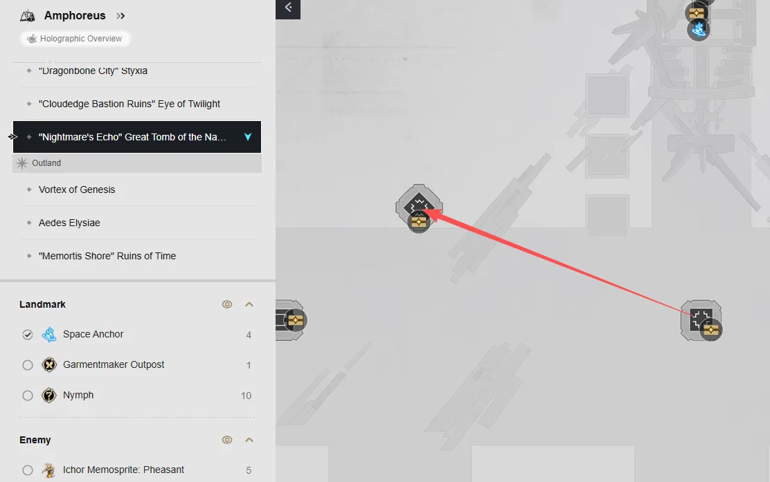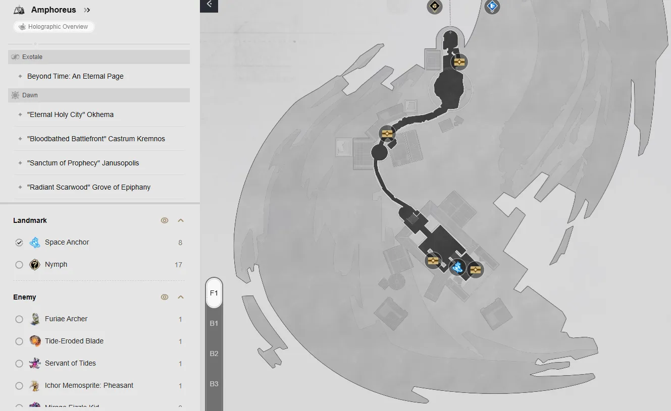 Nel livello F1 della mappa ci sono sei forzieri. Puoi raggiungerli teletrasportandoti alle ancore spaziali del Cortile delle Rovine e della Tomba della Chiarezza, quindi segui la mappa per individuare ogni forziere.