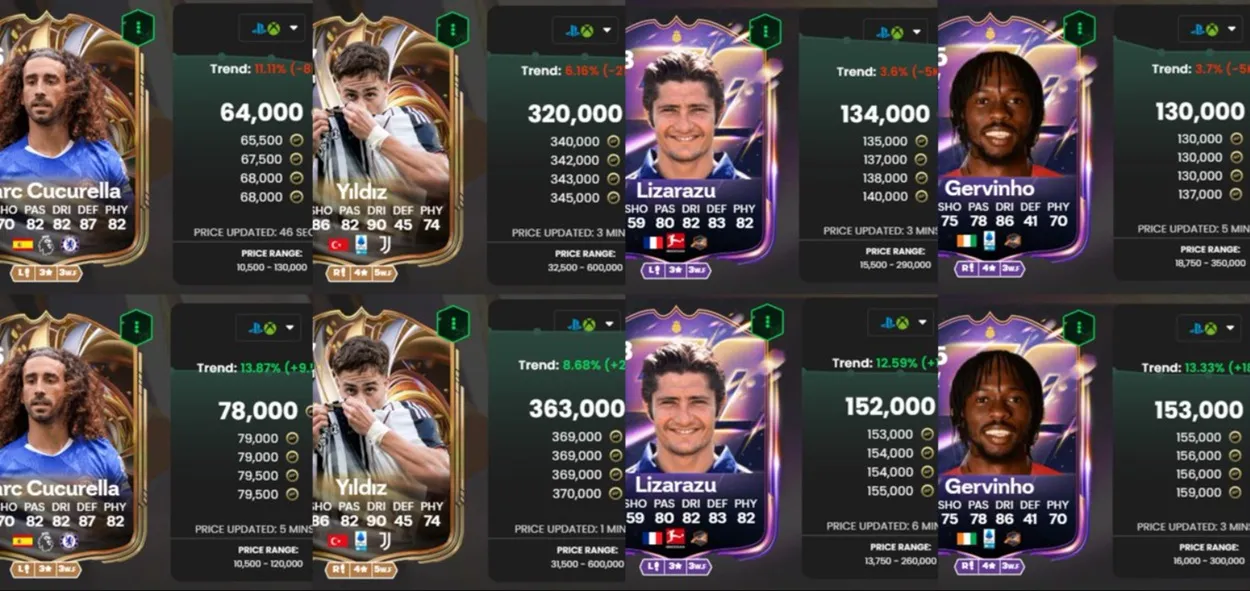 Il secondo metodo sulla nostra lista è il metodo Card Flipping, che è anche uno dei modi più antichi e affidabili per guadagnare monete FUT in EA FC 26. Puoi fare riferimento a questo metodo come quello del mercato azionario. Il concetto qui è semplice: devi monitorare il movimento dei prezzi di alcune carte, acquistarle a buon mercato e venderle quando il loro valore aumenta. Esistono tre metodi per lanciare le carte che sono;
