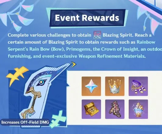 Il completamento di queste attività premia Blazing Spirit, la valuta di progressione dell’evento. Man mano che il totale del tuo Spirito Ardente aumenta, sbloccherai ricompense come Primogem, una Corona dell’Intuizione, l’arco esclusivo dell’evento Arco della pioggia del Serpente Arcobaleno e i suoi materiali di raffinazione.