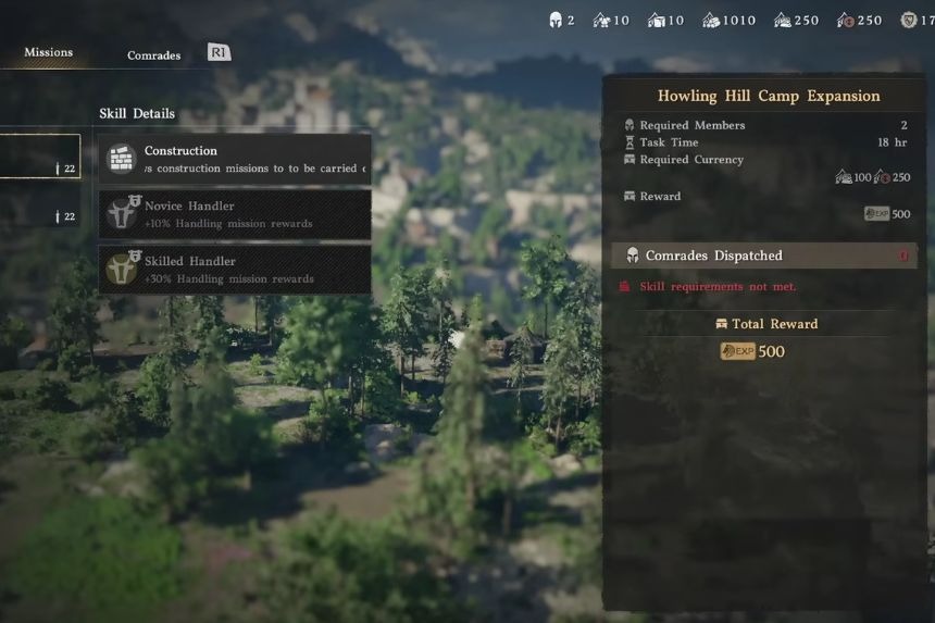 Successivamente, devi attendere 17 ore di gioco per completare questa missione. Trascorso questo tempo, riceverai un messaggio sullo schermo che indica che la missione è completata. Successivamente, un messaggio sullo schermo indicherà cosa fare dopo per espandere il tuo accampamento. Per fare ciò, apri nuovamente la mappa, che hai utilizzato per inviare le tue Freeswords, e seleziona le opzioni relative all’accampamento.