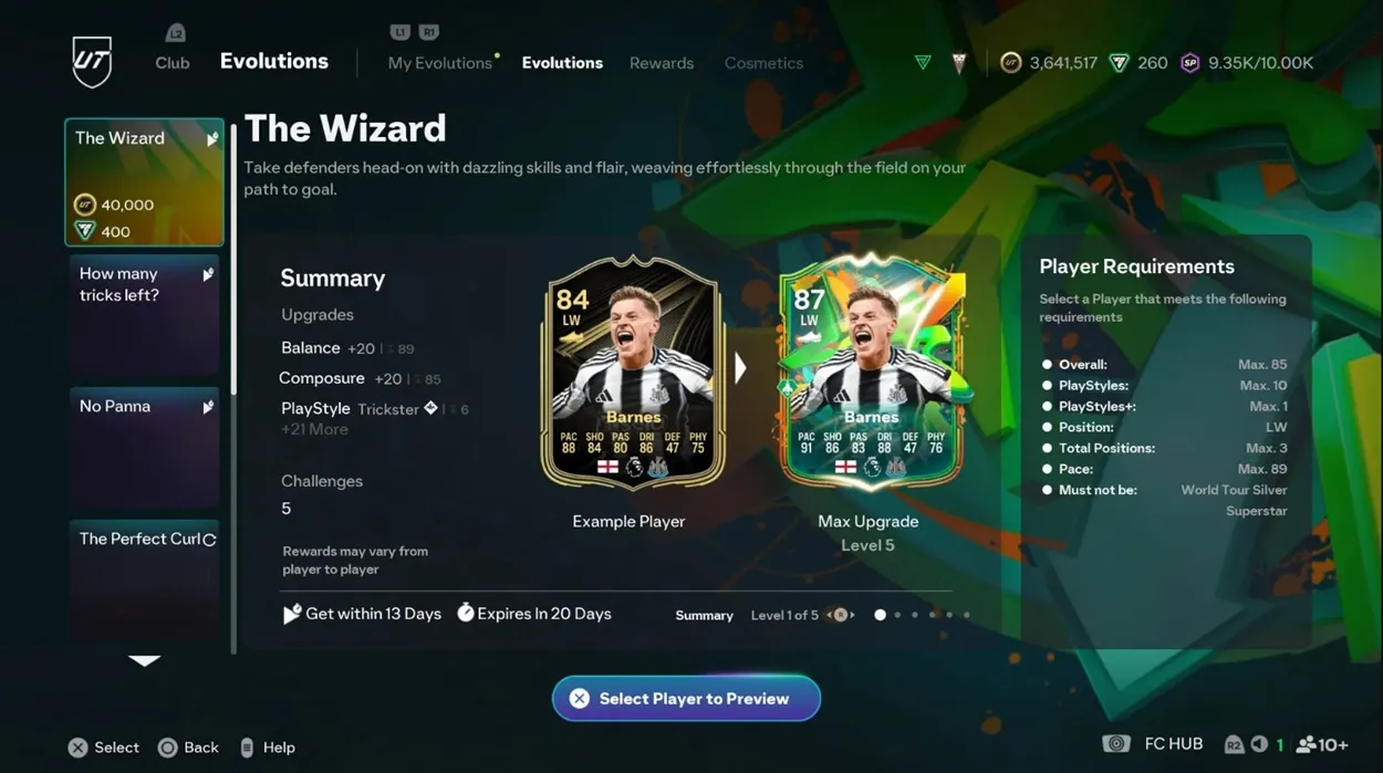 In FC 25, Wizard Evolution è un percorso di aggiornamento dal vivo che consente ai giocatori di trasformare la propria ala sinistra in una minaccia creativa e abile. Per farlo, hai bisogno di 40.000 monete e dopo aver selezionato una carta LW idonea, puoi semplicemente aumentarla fino a una valutazione complessiva di 87, massimizzando al tempo stesso il dribbling, l’agilità, i passaggi, i tiri, ecc.