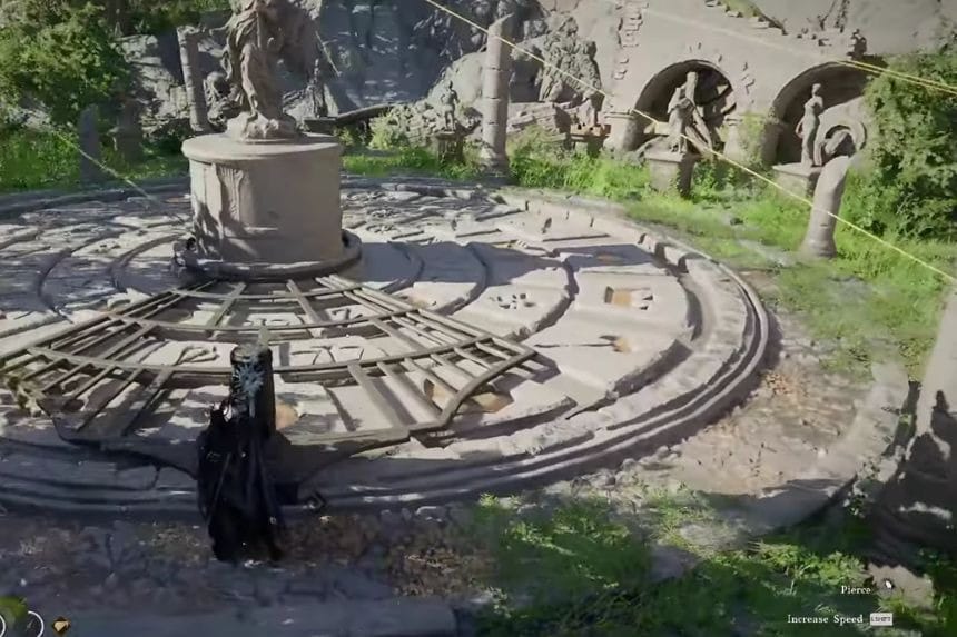 Per il simbolo finale, devi spostarti a sinistra e continuare a ruotare finché non torni indietro verso il simbolo del cavallo. Prima che tu possa finire, noterai un pilastro che blocca il percorso. Esci dal meccanismo, sposta il pilastro di mezzo, quindi interagisci nuovamente con il puzzle.