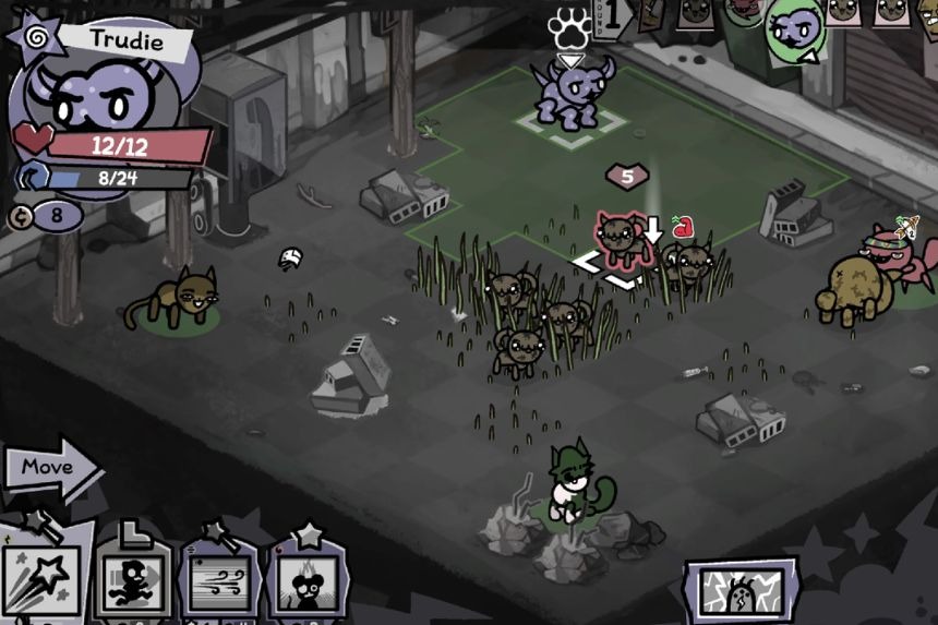 Maisie è un mini-boss contro cui combatterai in The Alley. Sembra un carro armato ma non ti attaccherà direttamente. Invece porterà cinque gattini che combatteranno con te. Il trucco principale di Maisie è sostenere i suoi gattini. Ogni volta che usi un’abilità sui suoi gattini, lei si teletrasporterà da quel gattino e il gattino andrà nel luogo in cui si trovava Maisie prima. Durante il suo turno, si sposterà accanto ai suoi gattini e poi li leccherà, dando al gattino +1 danno.