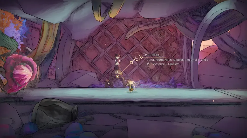 Sulla via del ritorno, preparati per un’imboscata al nemico vicino al Cristallizzatore. Sotto questo nemico c’è della madreperla cristallizzata. Usa il punto di presa per attraversare il lago, quindi cerca sopra di esso una camera nascosta a cui puoi accedere con la forcina. All’interno c’è un altro componente di rivestimento.