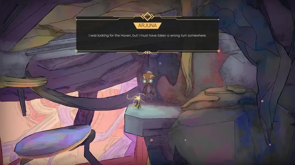Al bivio successivo, il sentiero superiore conduce ad una Conca di Madreperla, mentre il sentiero inferiore prosegue la progressione. Prendi il percorso inferiore per raggiungere una camera aperta con un NPC chiamato Arjuna.
