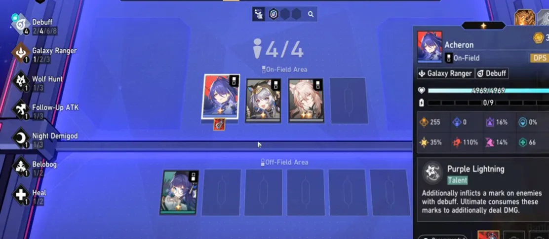 3. Attivazione di Acheron: Acheron entra, il talento garantisce direttamente un elevato aumento del danno (per livello di debuff).