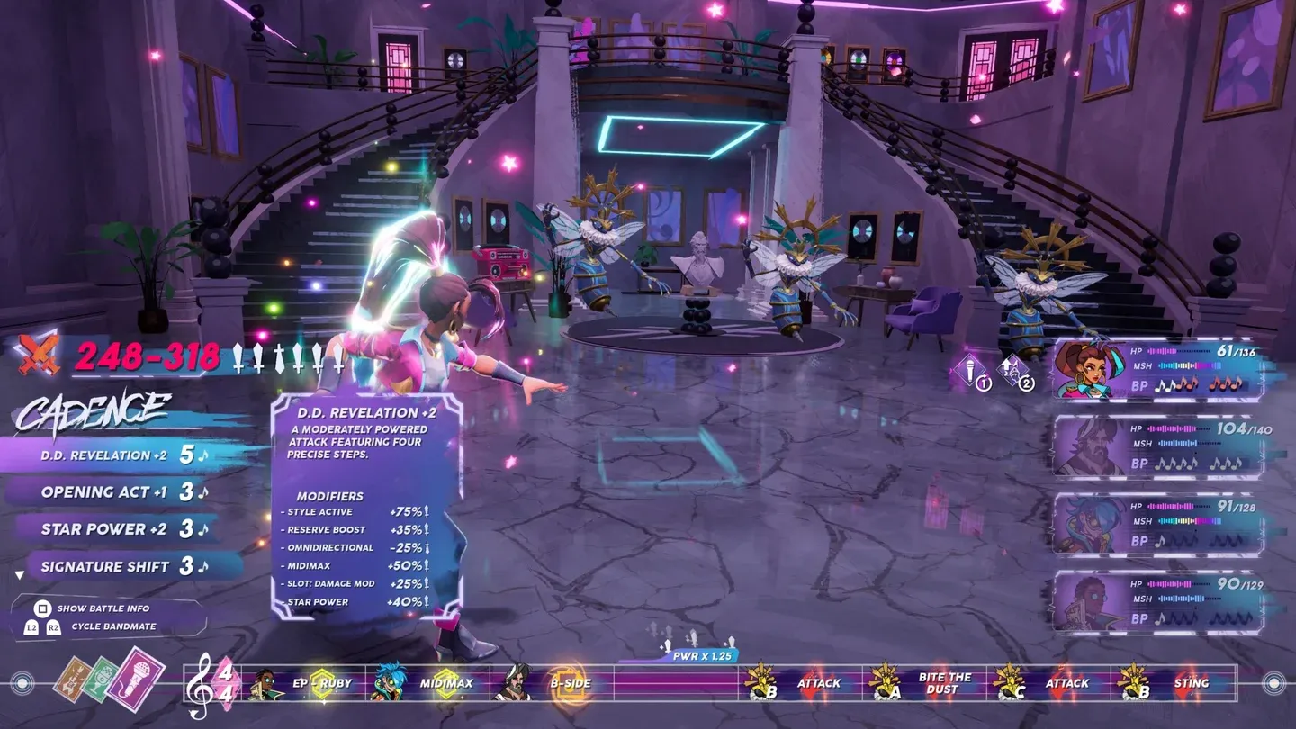 La base musicale cambia genere in ogni strofa: viola per il pop, giallo per il rock, blu per l’EDM, verde per il rap. Qualunque sia il genere del personaggio che corrisponde allo stile attivo, ottiene un significativo aumento di potenza nelle sue azioni in quel round. Pianificare attorno a questo, piuttosto che ignorarlo, è la differenza tra affrontare i combattimenti con disinvoltura e sbattere contro i muri.