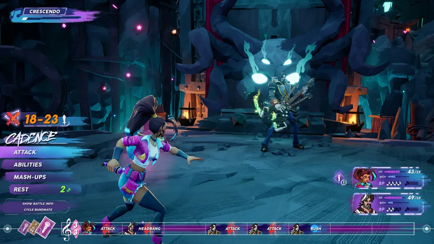 Ogni battaglia in People of Note è divisa in round chiamati Stanze. Durante la tua Stanza, puoi agire con i membri del tuo gruppo nell’ordine che preferisci e molte abilità premiano il sequenziamento intelligente. L’atto di apertura di Cadence, Songstone, ad esempio, infligge danni doppi se è la prima azione utilizzata in una strofa, quindi guidare con lei ripaga costantemente. Fret ha un’abilità che cura il gruppo ogni volta che un membro subisce danni, che diventa una pietra angolare della sopravvivenza nei combattimenti contro i boss.