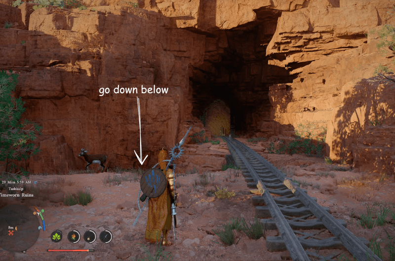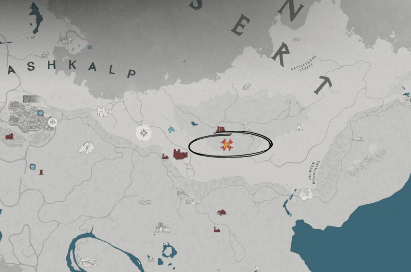Dirigiti verso la posizione contrassegnata che si trova a est di Istituzione città dentro Deserto Cremisi. E incontrerai i binari della ferrovia, segui i binari e ti condurrà direttamente all’ingresso del tunnel ma non entrare nel tunnel perché il tesoro si trova sotto di esso.