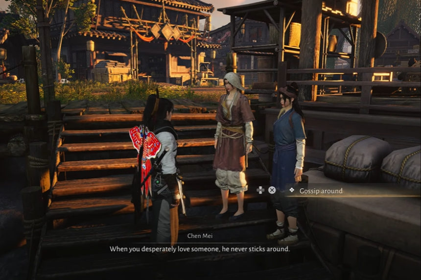 Per iniziare la missione A Tearless Farewell, vai nella posizione contrassegnata sulla mappa sopra. Una volta raggiunto il molo di Tianjing in South Gate Avenue, troverai Chen Mei e Yang Ping che chiacchierano sulle scale dietro Zhong Wenping. Devi parlare con loro per iniziare la missione Tearless Addio.