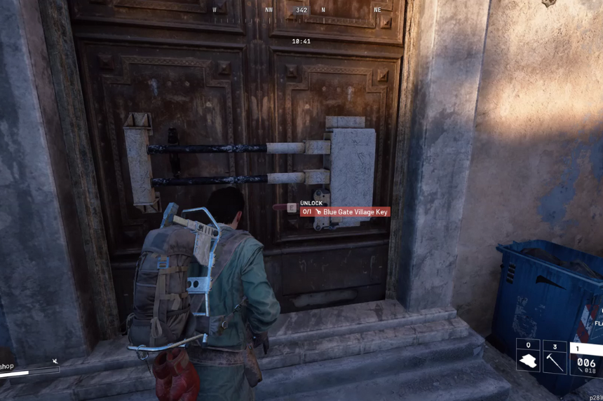 - Avvicinandoti alla porta, noterai il messaggio “Usa la chiave del villaggio del cancello blu per sbloccare”.