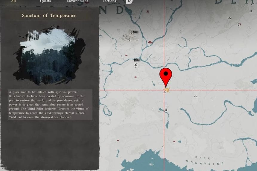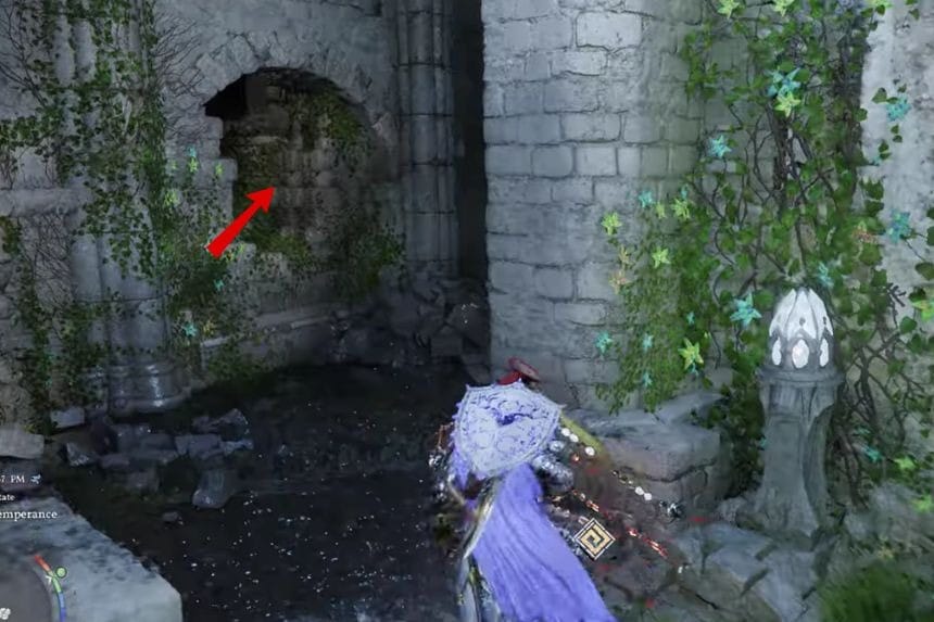 Per trovare gli stivali a piastre protettive di Odeck, puoi guardare sulla mappa e trovare la posizione Unicorn Cliff e guardare in basso per trovare il Santuario della Temperanza. Quando raggiungi la posizione, salta giù e spostati a sinistra finché non trovi la porta. Successivamente, attraversa la porta e il buco nel muro. Sulla destra troverai il muro ricoperto di rampicanti e, muovendoti tra i rampicanti, troverai il baule. Aprite il baule per trovare gli stivali.