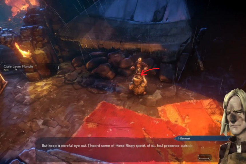 Dopo essere entrato nella sala mensa, parla con Fillmore e lui ti darà la maniglia della leva del cancello dopo una breve conversazione. La maniglia della leva del cancello viene aggiunta automaticamente al tuo inventario. Dovrai usare questa maniglia per aprire il cancello principale per continuare i tuoi viaggi verso Sacrament attraverso le radure di Orban a est.