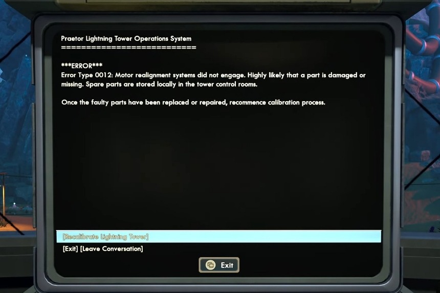 Per raggiungere questa stazione di messa a terra, dovrai recarti alla Torre del Fulmine – Nord-Est a Praetor. All’interno, dovrai accedere al sistema operativo della Lightning Tower di Praetor sul computer. Scegli semplicemente “Ricalibra la torre del fulmine” che ti mostrerà un messaggio di ERRORE che ti chiede di riparare o sostituire le parti difettose per ricominciare il processo di calibrazione.