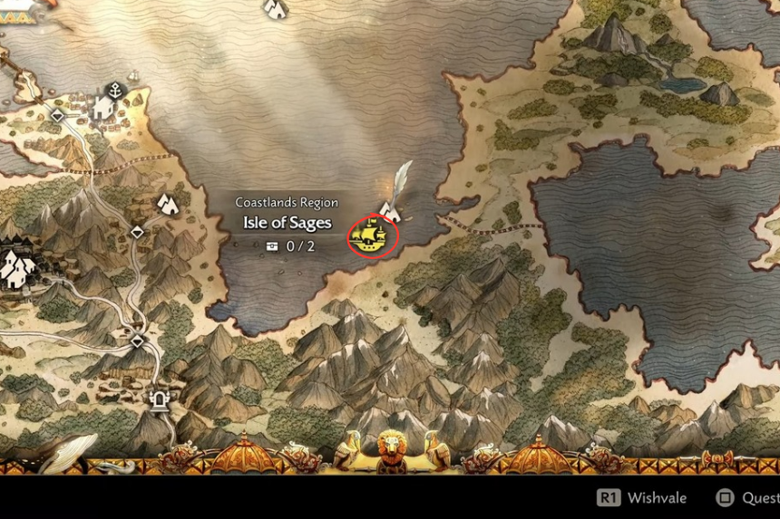 Dopo aver raccolto tutti e cinque i frammenti, dirigiti verso l’Isola dei Saggi nella parte sud-orientale di Outersea. Potresti aver notato il cancello qui in precedenza, non si aprirà finché non avrai una nave, che è richiesta nel capitolo 3 dell’arco “Il Donatore di Tutto” ma può essere ottenuta prima.
