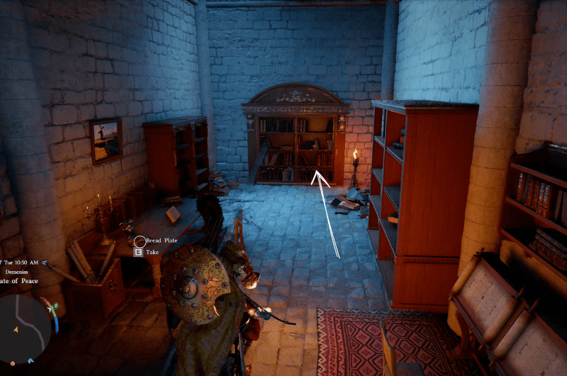 Quando sarai alla fine del percorso giù per le scale, raggiungerai una stanza chiusa. Questa camera ha una camera segreta a cui è possibile accedere tramite il scaffale per libri mostrato nell’immagine sopra. Per entrare nella camera segreta, devi farlo camminare fino allo scaffale e il personaggio spingerà automaticamente lo scaffale ed entrerà nella camera segreta.