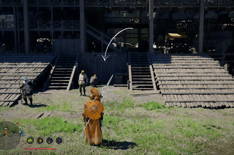 Prova a identificare il porta di legno nel Golden Trading Post mostrato nell’immagine sopra, questa porta di legno sembrerà fuori posto e dovresti essere in grado di vedere due NPC conversare davanti all’ingresso segreto. Allora dovresti farlo accovacciarsi per entrare nell’area segreta.