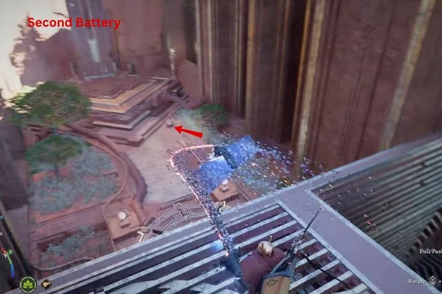 Trasporta il pacco batteria verso l’alto dove puoi vedere il baule. Per andare verso l’alto, premere L3. Apri il baule e richiedi le tue ricompense all’interno. Queste ricompense includono Surge III e Faded Abyss Artefact. Dopo aver raccolto le ricompense all’interno del baule, trasporta la batteria fino all’ultima presa di corrente e collegala. Ora vedrai un grande quadrante di fronte a te. Usa un attacco Palmo della Forza in salto per attivarlo. Una volta acceso, l’Abisso viene ripristinato e puoi andare avanti e raccogliere l’Artefatto dell’Abisso che aspetta lì. Questo completerà il puzzle.