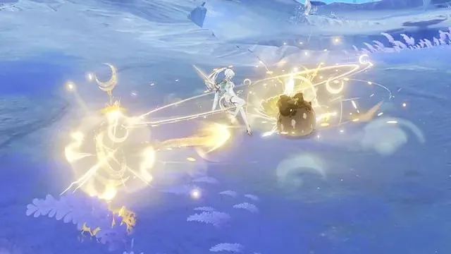 Quando queste condizioni sono soddisfatte, il cristallo difensivo viene sostituito dal potenziale offensivo. L’attivazione della reazione genera oggetti chiamati “Moon Warts” o “Moon Drifts”. Una volta che tre si accumulano, risuonano in una “Risonanza lunare” o “Dritta lunare”, infliggendo un’esplosione significativa di danni geografici AoE.