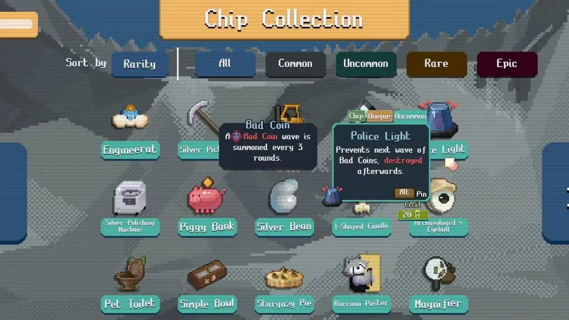 Police Light è un chip di protezione monouso. Quando il Negozio mostra un prossimo round di Bad Coin, Police Light impedisce a qualsiasi cattivo di attivarsi, quindi si distrugge. Bruci il chip per saltare un round potenzialmente finale. Questo scambio vale la pena nelle fasi successive, quando un singolo round negativo può spazzare via una posizione forte. Non è un chip in scala, ma averlo equipaggiato quando appare un round di Bad Coin è un puro sollievo.