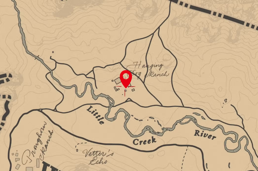 Troverai l’Hanging Dog Ranch appena a nord del fiume Little Creek. A seconda di dove ti trovi nella storia, è controllato dagli O’Driscoll Boys (capitoli 1-6) o dalla Laramie Gang (nell’epilogo). Questo posto pullula di nemici e uno di loro brandisce persino una pistola Gatling nella finestra del fienile, quindi preparati per una dura battaglia.