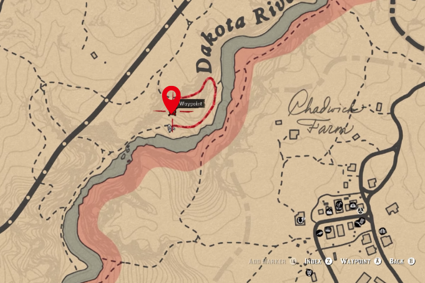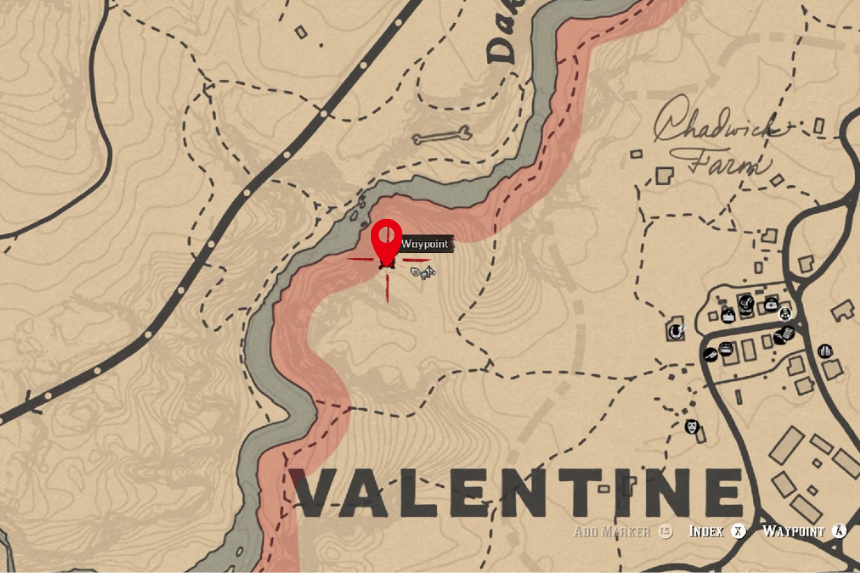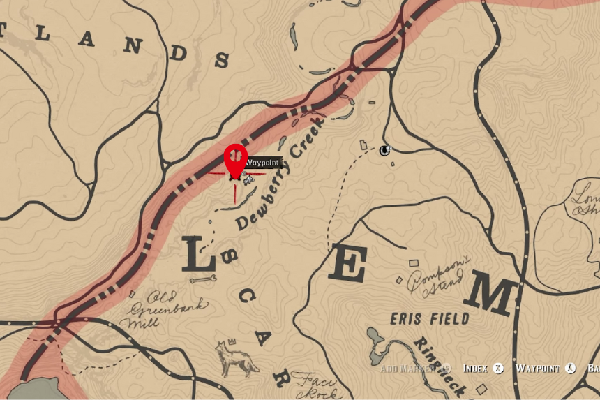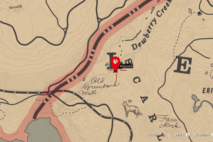 Nel Dewberry Creek troverai il letto di un fiume prosciugato. Vicino alla riva del fiume troverai l’osso di dinosauro situato vicino a un masso.
