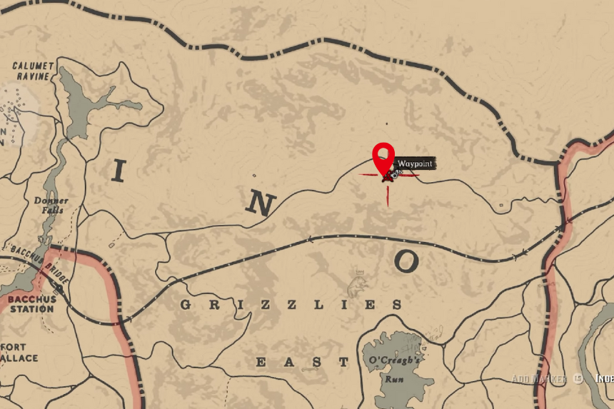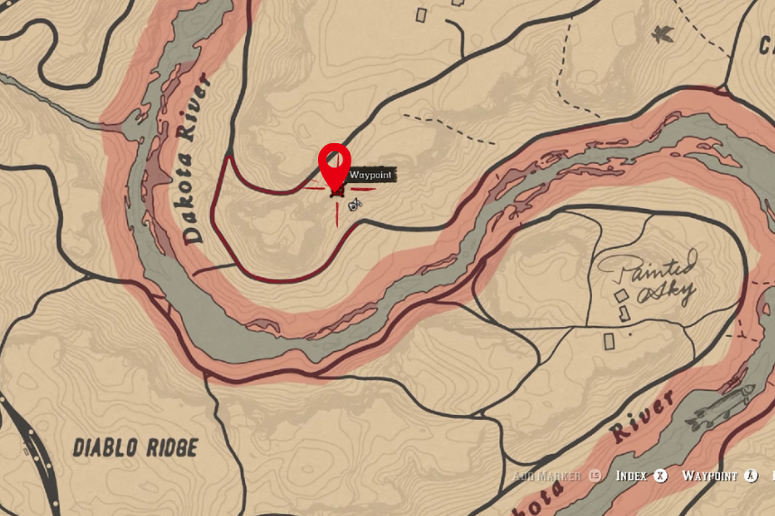 Dirigiti verso la posizione sulla mappa sopra e troverai un grande canyon. Di fronte a te ci sarĂ una grande montagna. Ai piedi della montagna, vicino ad alcuni cespugli, troverai l’osso di dinosauro.