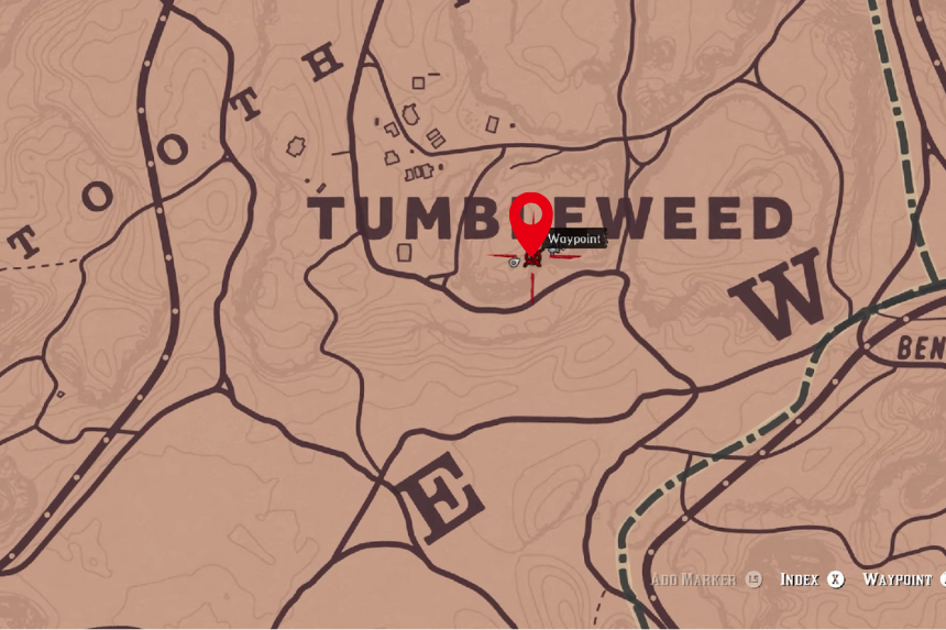 Vai verso il nord di Tumbleweed. Troverai una prateria brulla. In cima alla collina troverai l’osso di dinosauro vicino ad alcuni cespugli.