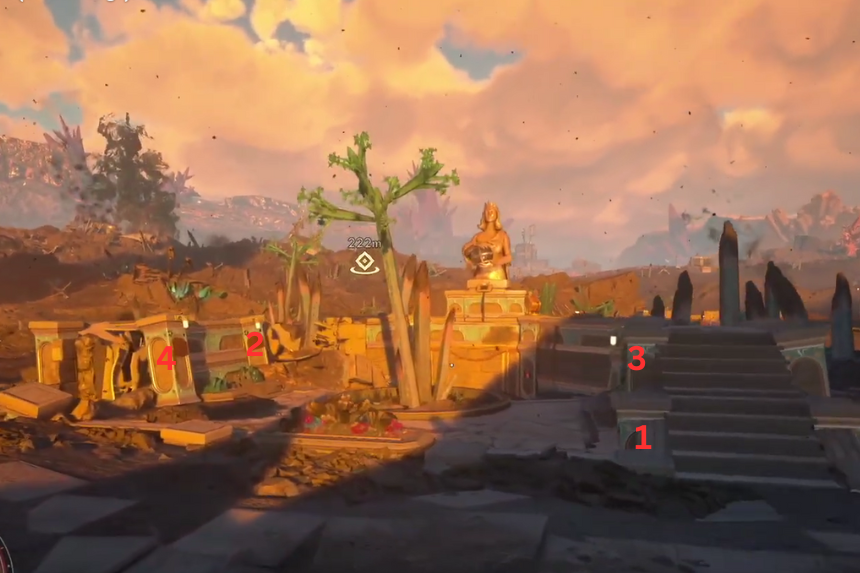 A nord-est di Scrapper’s Den troverai un memoriale in rovina con una statua e quattro targhe a terra. Interagendo con le placche si solleverà la statua e si rivelerà una porta nascosta sottostante.