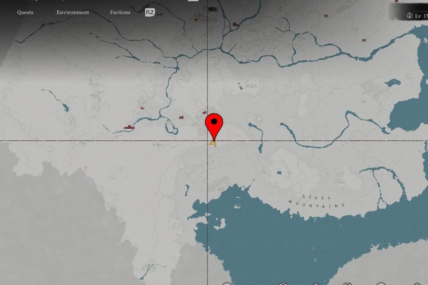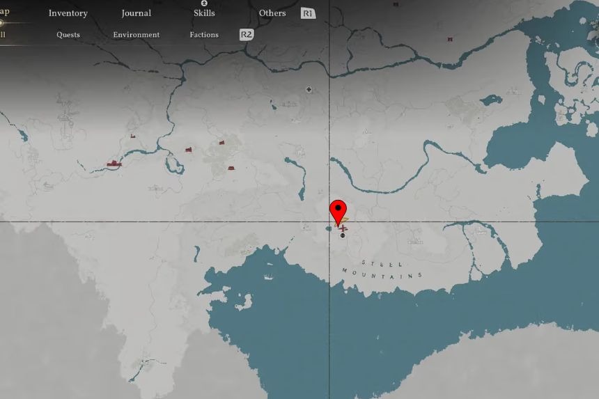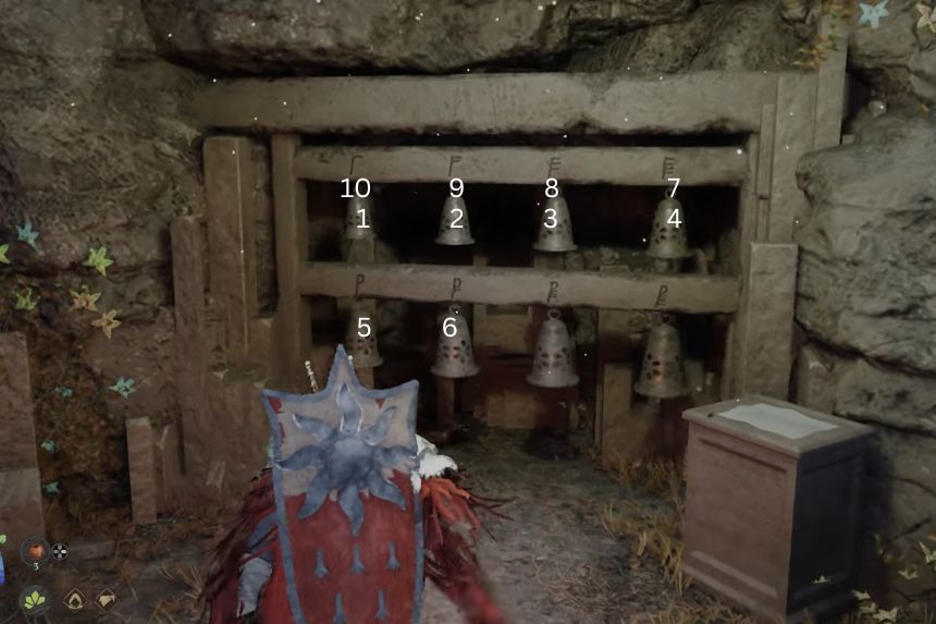 Puoi trovare le Rovine delle Montagne d’Acciaio del Deserto Cremisi molto più a sud nelle Montagne d’Acciaio, vicino alla Guglia dell’Intuizione. Dopo aver raggiunto il luogo, raccogli la mazza posta vicino alle campane e leggi le note scritte sul muro accanto ad esse. Le note indicheranno la sequenza di azioni da seguire per completare il puzzle.