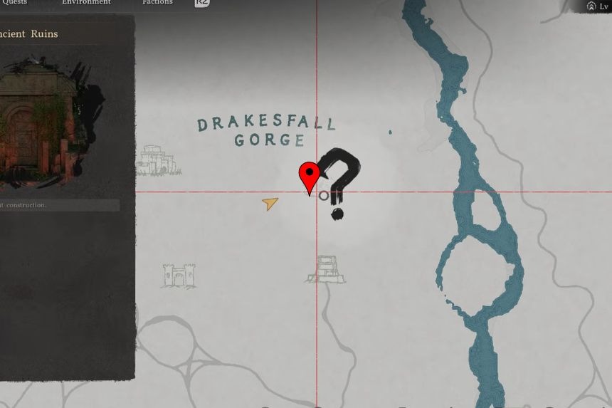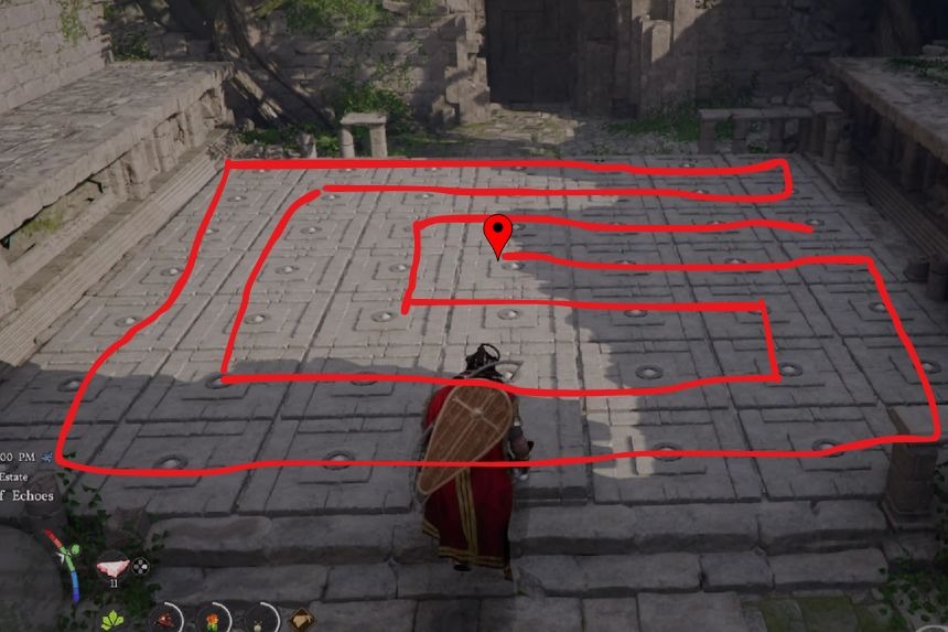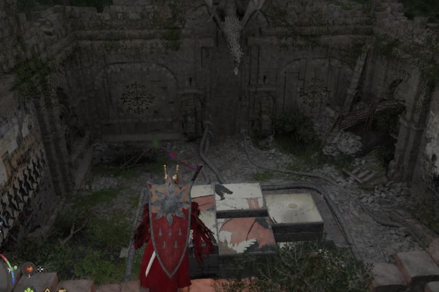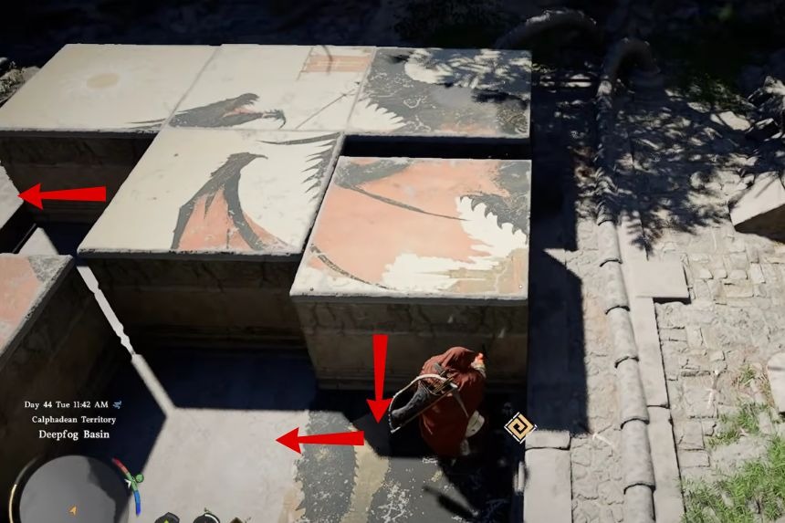 Troverai le Rovine della Testa del Drago del Bacino della Nebbia Profonda del Deserto Cremisi nella parte settentrionale di Hernand, vicino al Posto di Guardia Centrale. Questo puzzle richiede al giocatore di posizionare i blocchi grandi per completare l’immagine mostrata sul pavimento.