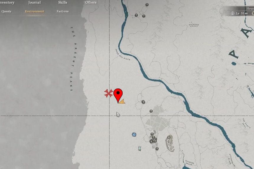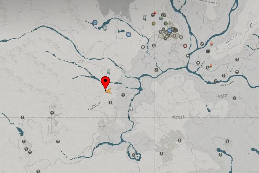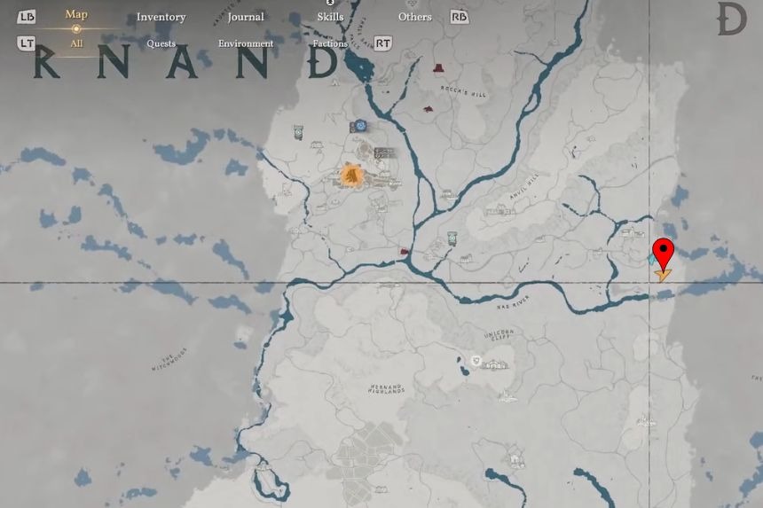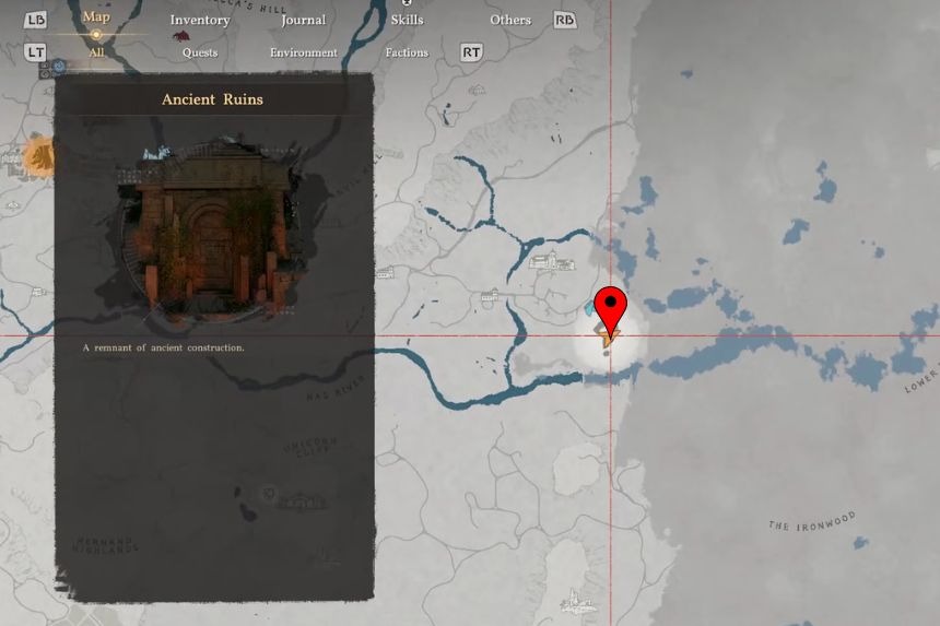 Puoi trovare le rovine del Crimson Desert Duskwood Waterside vicino al fiume, tra la grotta e il Kilnden Workshop.