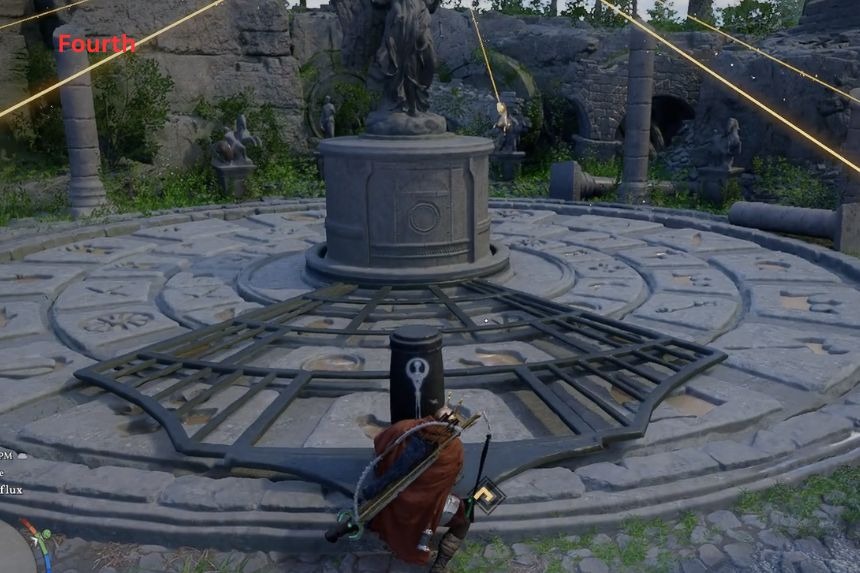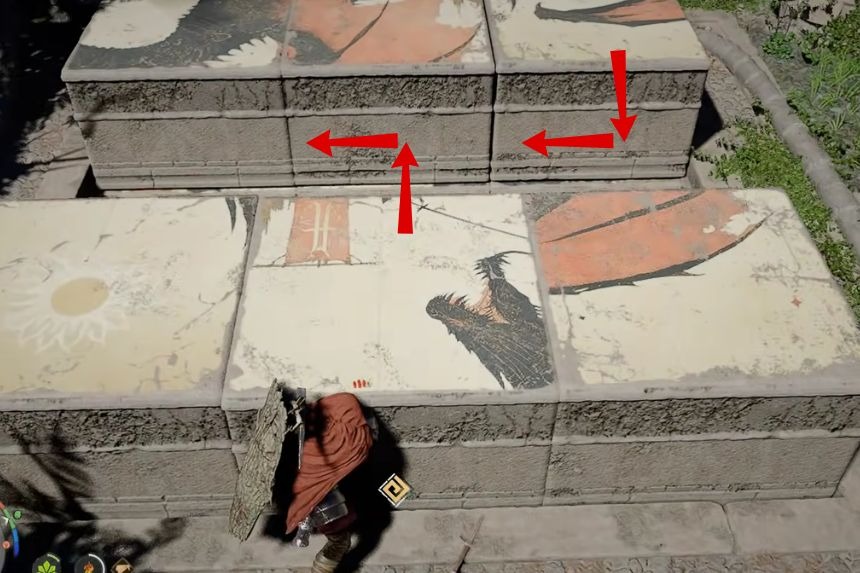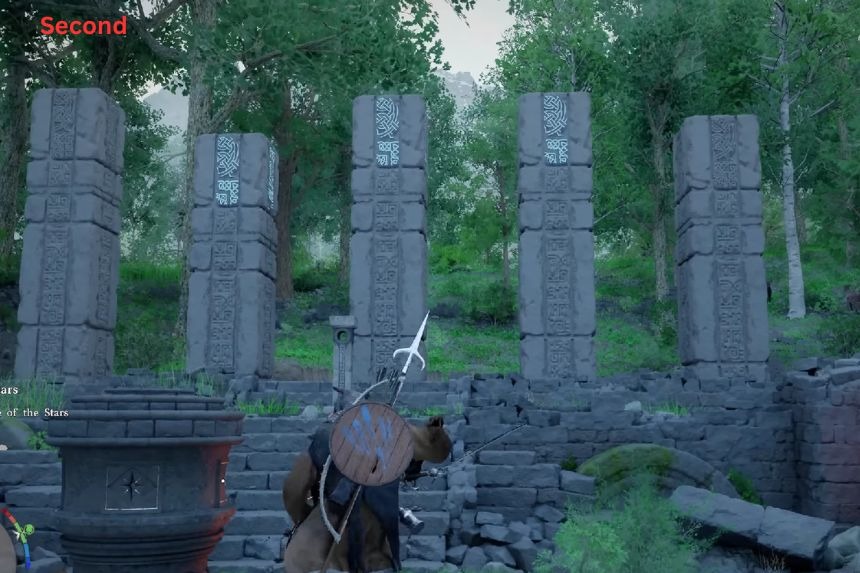 Per iniziare, posiziona il pilastro in una posizione in cui sia allineato con il simbolo dello scudo. Se posizionato correttamente, si illuminerà , attivando la parte successiva del puzzle. Successivamente, posiziona il pilastro in una posizione in cui sia allineato con il simbolo della bilancia. Per completare il puzzle, posiziona il pilastro in una posizione in cui sia allineato con i due simboli del cavallo, uno all’interno del cerchio e uno all’esterno del cerchio.
