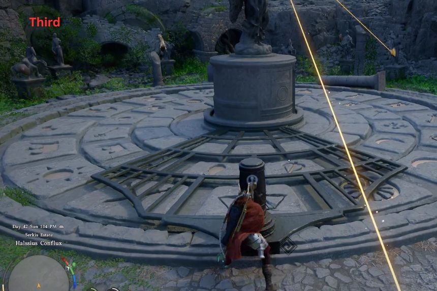 Puoi trovare il puzzle Halssius Conflux del Deserto Cremisi vicino alla Casa della Guarigione. Questo puzzle coinvolge un pilastro mobile al centro dell’area del puzzle. Per iniziare, usa il tuo attacco Pugnalato sul pilastro, permettendogli di ruotare attorno al centro dell’area del puzzle. Devi far corrispondere la posizione del pilastro con i simboli evidenziati dalla luce della statua vicina.